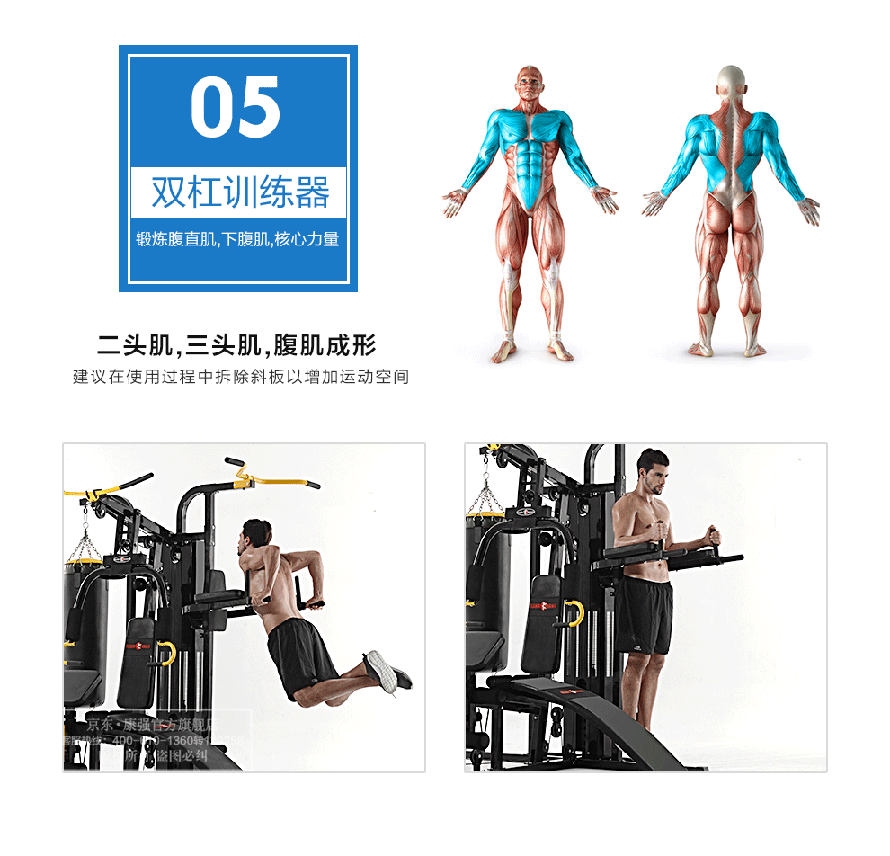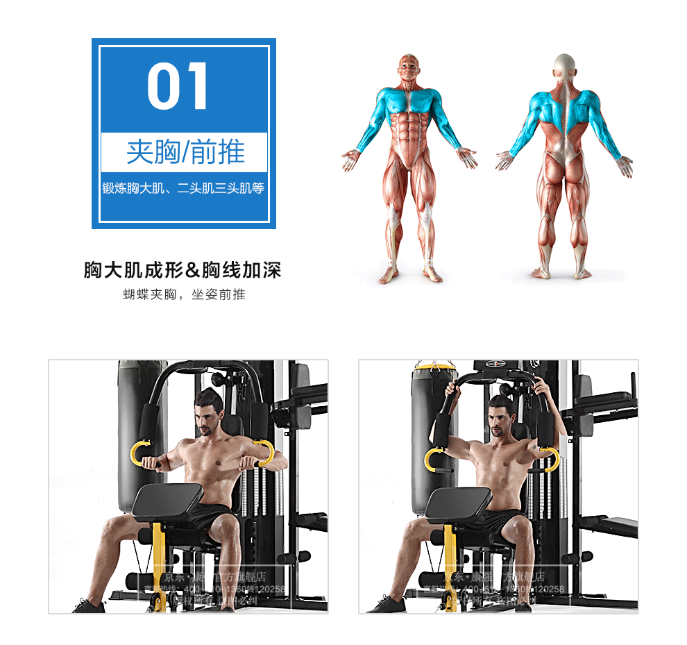 功能特點(diǎn):夾胸/前推,高低位拉桿,綁腿帶訓(xùn)練,勾腿訓(xùn)練,雙桿訓(xùn)練,斜仰臥板,蹬腿訓(xùn)練,拳擊訓(xùn)練等